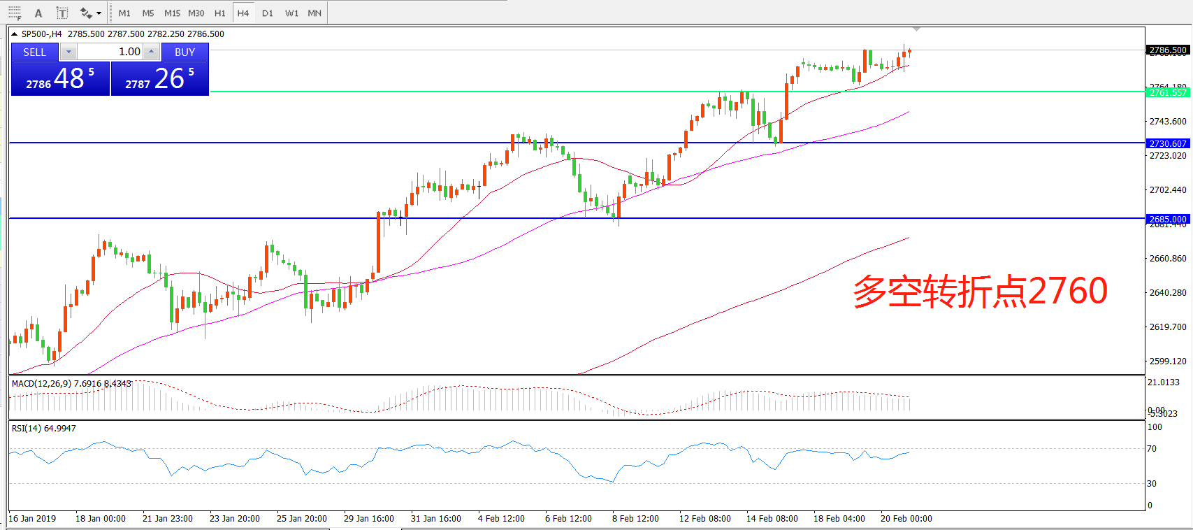 4小时图看,SP500高位震荡后依然呈现明显的上升趋势状态,21均线成为短线支撑,MACD红柱增加,延续涨势是大概率事件。