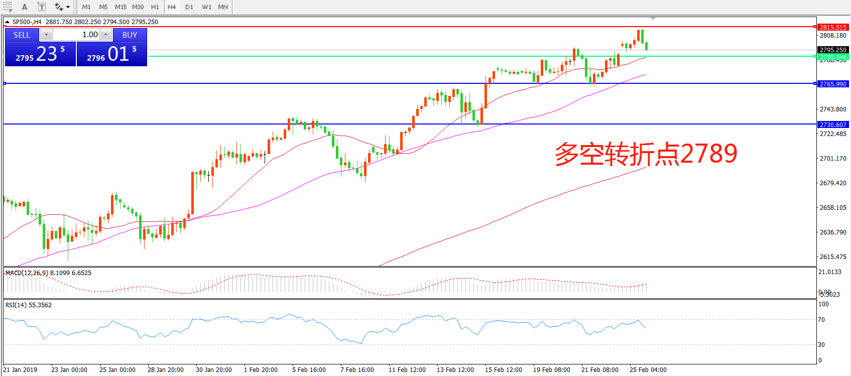 2月25日,第七轮中美经贸高级别磋商在美国首都华盛顿结束。美国总统特朗普表示,磋商取得实质性进展,美国将延后原定于3月1日对中国产品加征关税的措施。贸易谈判乐观情绪推动,周一标普涨0.1%盘中破2800点,最终收报2796.11点。