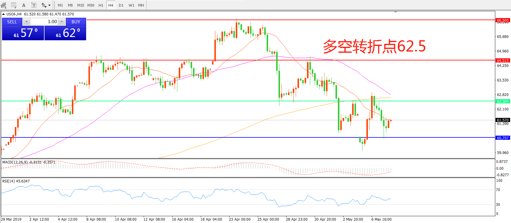 中美贸易谈判不确定性令原油等风险资产遭受抑制,同时美国原油产量继续走高也加大了市场对供应面的担忧。美油周二承压走低,收报61.53元/桶。油价下跌除了与美元走高和国际风险偏好大幅回落有关,也受美国全面制裁伊朗和原油供给局势影响。据路透报道,伊朗外交部将于5月8日宣布在伊朗核协议方面“缩减承诺”,而法国总统府方面表示,如果伊朗部分违反2015年伊朗核协议,欧洲将不得不重新制裁伊朗。早间公布的API原油库存超预期增加281万桶,市场重新聚焦到今晚22:30公布的EIA原油库存数据表现。