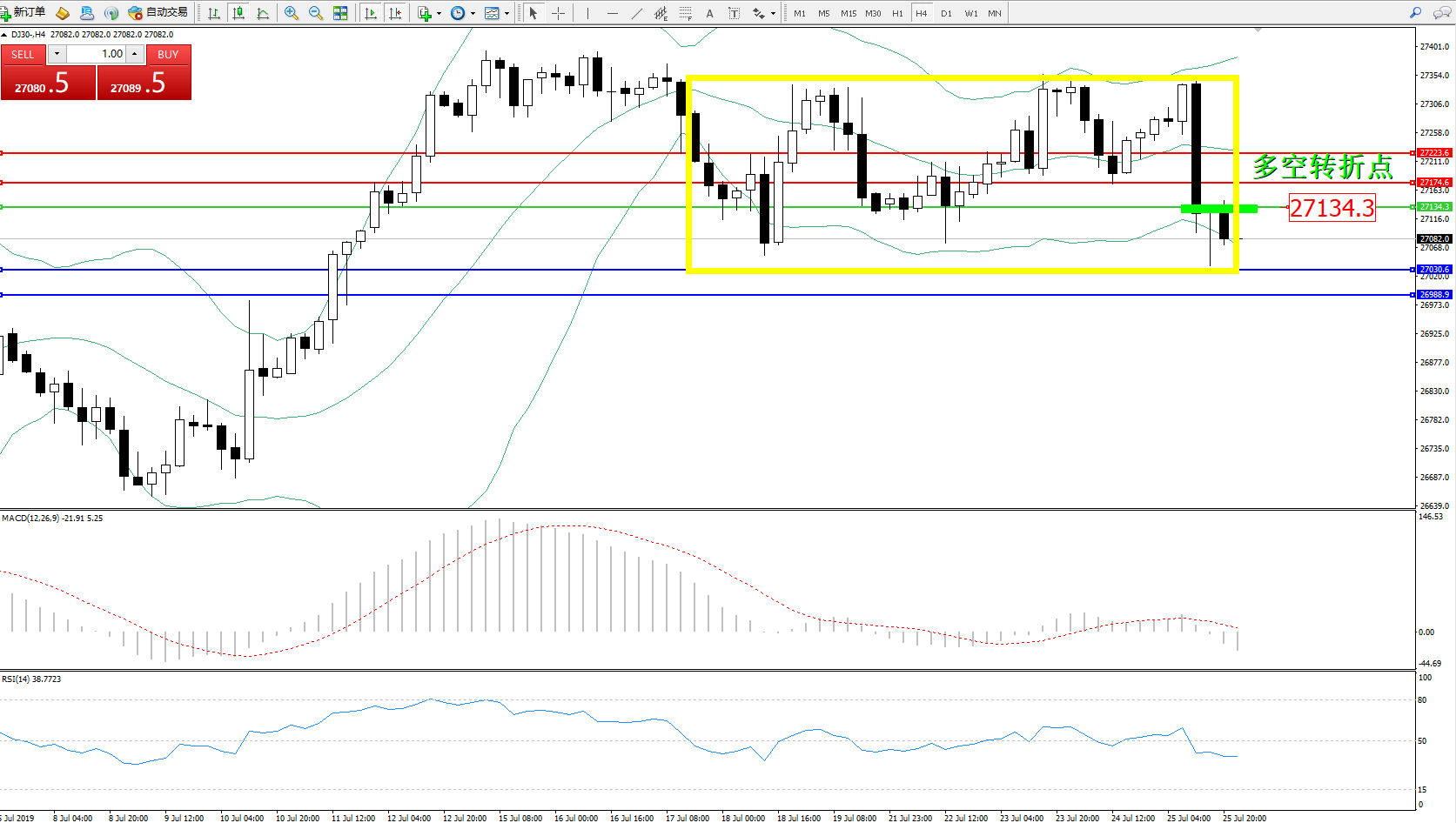 道琼斯指数7月25日(周四)收盘下跌129.00点,跌幅0.47%,报27140.98点。美国6月耐用品订单月率初值大幅好于预期,增加2%,预期0.7%,北京时间7月26日20:30,美国将公布第二季度GDP数据初值,可能对美联储下周降息幅度产生至关重要的影响。虽然美联储7月31日肯定能降息25个基点,但市场认为降息50个基点的可能性也有20%左右,这个比例似乎过高了。如果二季度GDP数据足够坚挺,这将最终打破美联储降息50个基点的预期,为美元带来复苏空间。