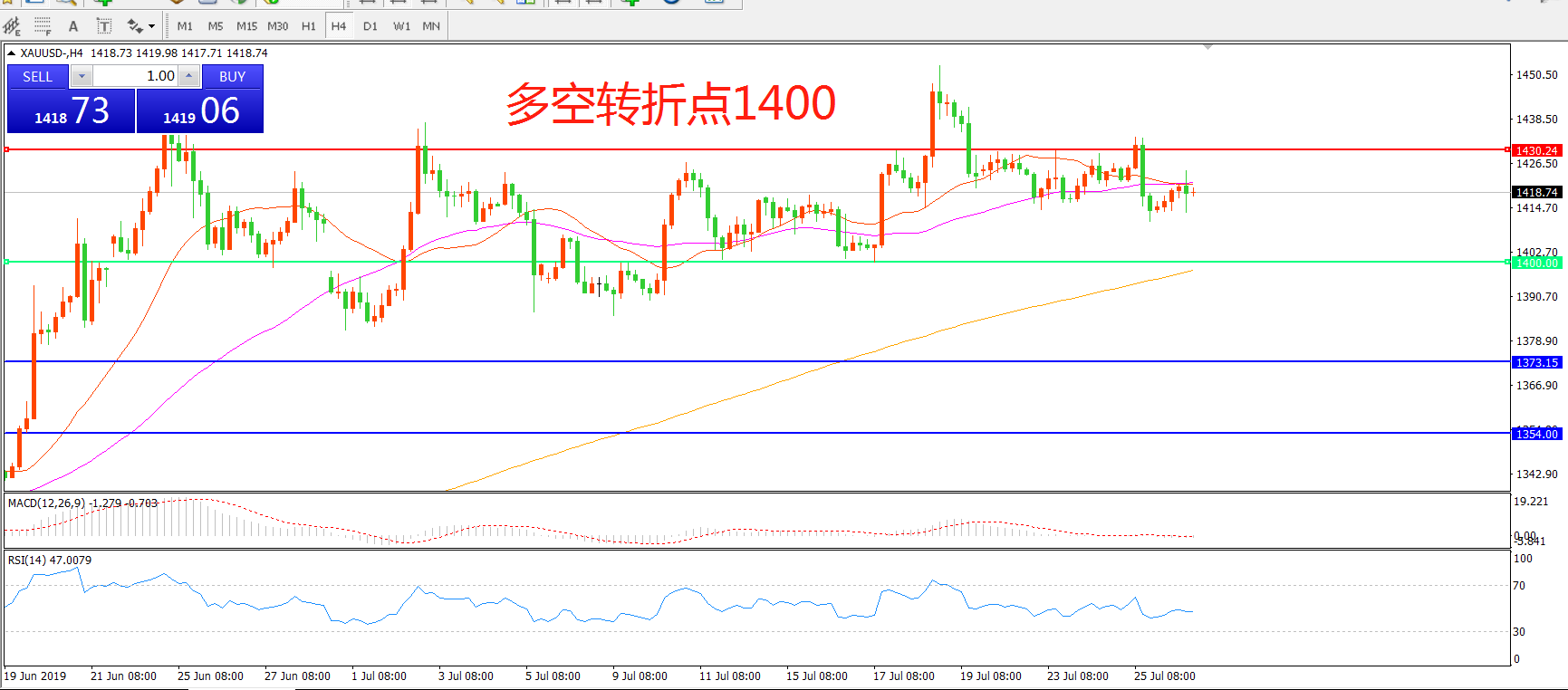 受欧洲央行利率决议、美国预算协议和美国GDP等因素推动,金价上周走势较为动荡,周中波动幅度达到20美元左右,周五小幅反弹后收报1418.74美元/盎司。本周周投资者将迎来超级数据周,美联储决议、非农就业数据等重磅数据纷至沓来。市场普遍预期美联储会降息,如果美联储周三坚持降息25个基点,金价有可能下跌,并测试1400美元/盎司水平,一旦美联储意外降息50个基点,则金价有望飙升,大行情一触即发!