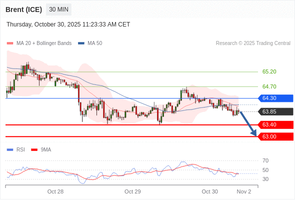 在 64.30 之下,看跌,目标价位为 63.40 ,然后为 63.00 。