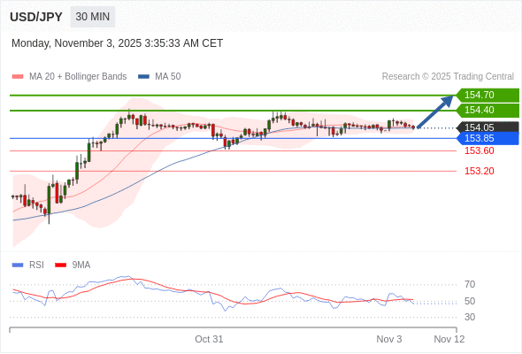 在 153.85 之上,看涨,目标价位为 154.40 ,然后为 154.70 。