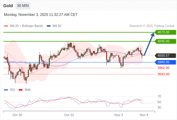 在 3980.00 之上,看涨,目标价位为 4045.00 ,然后为 4073.00 。