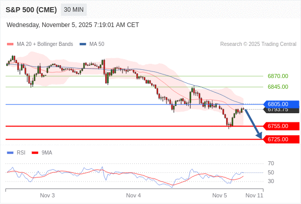 交易策略: 在 6805.00 之下,看跌,目标价位为 6755.00 ,然后为 6725.00 。
