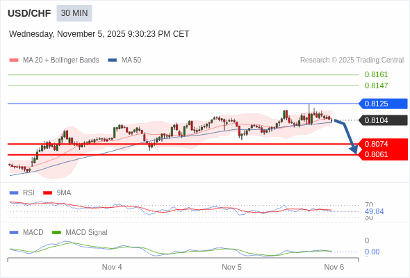 美元/瑞郎 当日内 : 逐渐下跌,当 0.8125 阻碍上行,则 0.8061 为目标位。