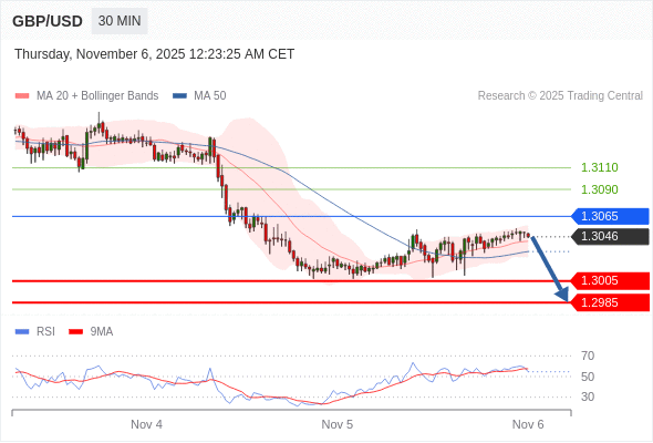 在 1.3065 之下,看跌,目标价位为 1.3005 ,然后为 1.2985 。