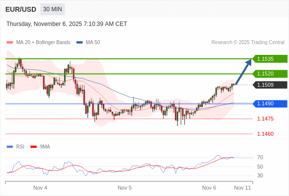 在 1.1490 之上,看涨,目标价位为 1.1520 ,然后为 1.1535 。