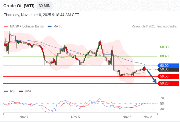 在 60.00 之下,看跌,目标价位为 59.55 ,然后为 59.25 。
