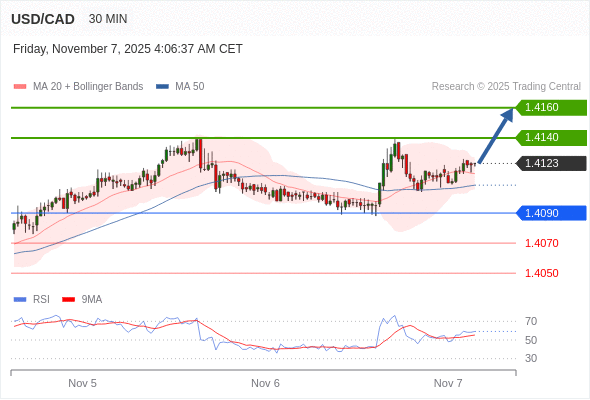 在 1.4090 之上,看涨,目标价位为 1.4140 ,然后为 1.4160 。