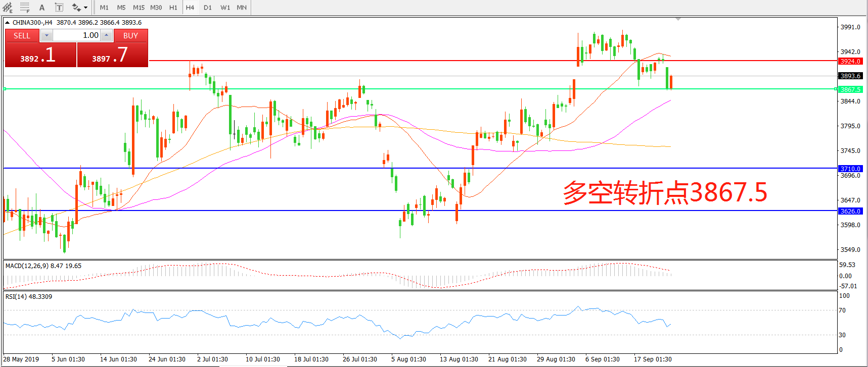 4小时图看,沪深300延续高位震荡,整体走势有所回暖,3924成为短期多空分水岭,MACD红柱减少,RSI指标走平,日内依然有回落风险,但中期走势依然偏多。