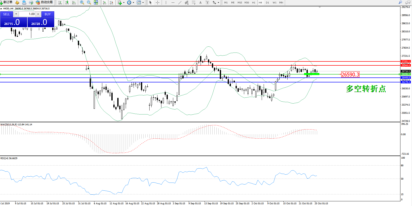 香港恒生指数1025日(周五)收盘下跌130.56点,跌幅0.49%,报26667.39点;港股小幅低开,随后沽压呈现扩大跌幅,恒指低见26621,香港统计局昨日公布9月份出入口数据。出口连续第11个月下跌,跌幅7.3%。多过预期跌7%。市场继续观望英国脱欧进展。同时,美联储下周的议息会议也备受关注。即将离任的欧洲央行行长德拉吉强调宽松政策与经济下行风险。有媒体报道,高盛预期美联储将会一如预期在下周宣布降息,同时会作出两大关键转变,可能会触动市场情绪。