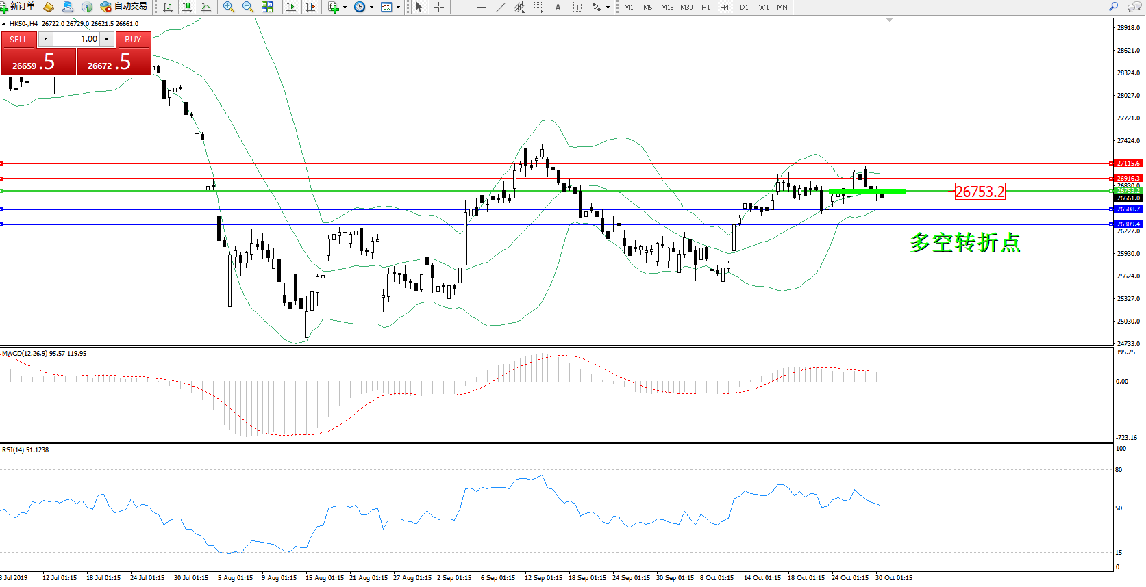 香港恒生指数1030日(周三)收盘下跌119.05点,跌幅0.44%,报26667.71点;港股小幅低开后曾反弹倒升22点。唯高位见沽压,再回落倒跌,并逐步扩大跌幅,恒指最触及26625A股三大股指今日集体回踩,盘中蓝筹板块持续疲弱,加上热点区块链概念股尾盘出现分化严重。外围市场整体走势偏弱,美股还需密切跟踪苹果的财报。最近该公司股价一路高歌猛进,屡创新高,但昨日的下跌是否会形成趋势反转也需要注意。