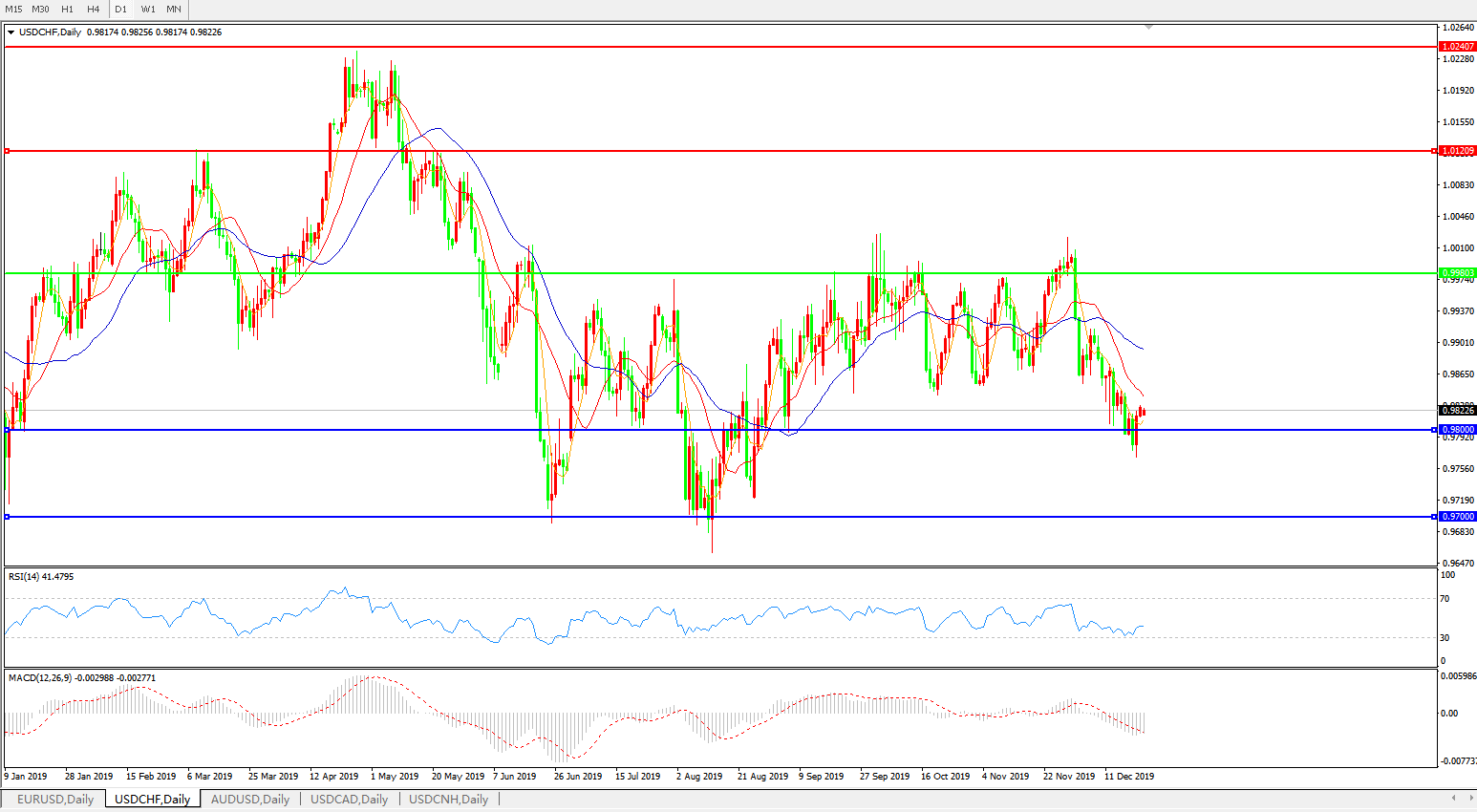 技术面简析:日线图均线呈有序空头排列,汇价止跌回升重回0.98关口上方,MACD运行于0轴下方且量能0轴下维持,RSI震荡走高,预计汇价在反弹整理后将进一步下行。