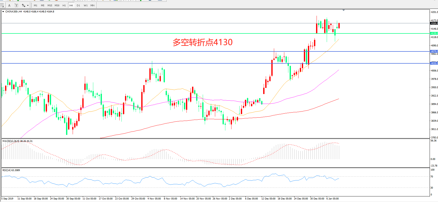 4小时图看,沪深300延续高位震荡,4130一线再度被收复,均线系统呈多头排列,MACD红柱缩短,RSI指标向上,日内震荡上行概率较大。