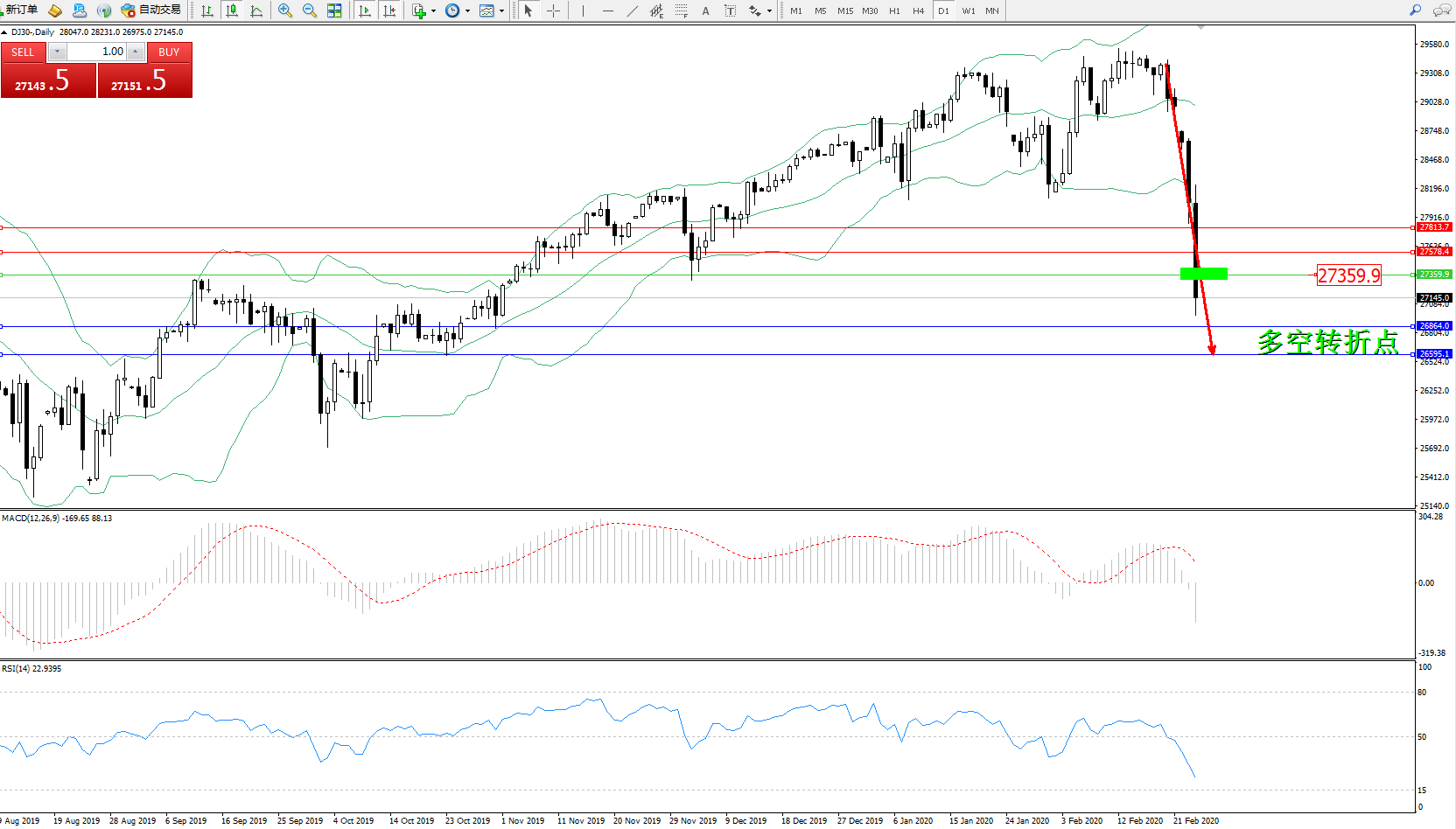 道琼斯指数2月25日(周二)收盘下跌879.40点,跌幅3.15%,报27081.36点。道指跌破27000点关口,为去年10月31日以来首次。疫情在中国以外快速扩散加剧了人们对其全球经济影响的担忧,促使部分人押注美联储将被迫降息,以缓解疫情带来的打击。美国10年期国债收益率纽市盘中跌至历史新低的1.305%,增强了关于央行降息的讨论。预期未来“美元有下档风险”,因美联储政策可能转向鸽派。市场参与者对美联储进一步放松政策的预期继续升温,货币市场预期6月会议上可能降息25个基点。今年全年,交易员预期美联储降息至1%-1.25%,低于当前区间1.5%-1.75%。