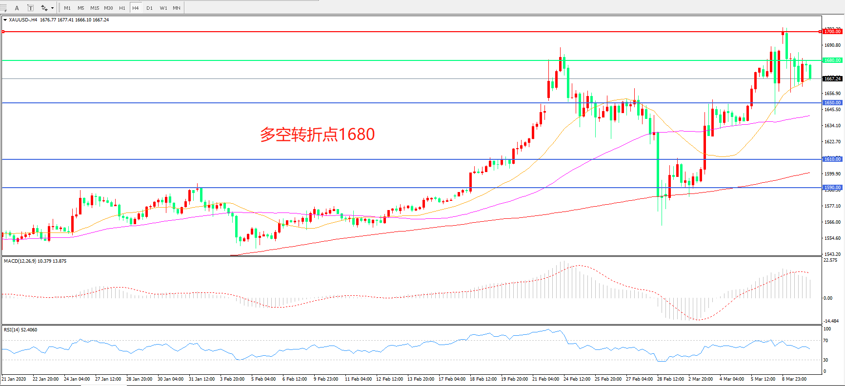 周一(3月9日),全球市场迎来“恐慌日”,油价暴跌近25%,创1991年海湾战争以来最大跌幅,美股暴跌触发23年来首次熔断,现货黄金一度冲高,突破1700关口,但因投资者在股市和能源市场暴跌之际抛售黄金以应付追缴保证金,金价小幅回落,收报1668.30美元/盎司。