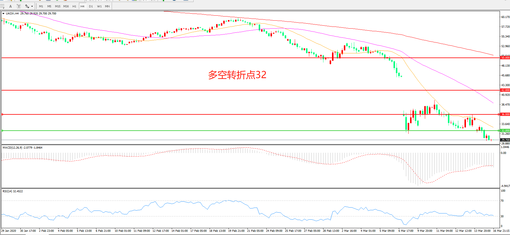 4小时图看,布油延续下行,整体表现低迷,32美元成为短期多空分水岭,均线系统呈空头排列,MACD绿柱增加,RSI指标走平,日内震荡下行概率较大。