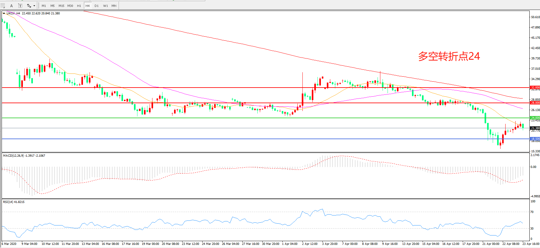 4小时图看,油价震荡上行,整体走势有所回暖,24美元成为短期多空分水岭,均线系统仍走平,MACD绿柱缩短,RSI指标走平,日内延续震荡概率较大。
