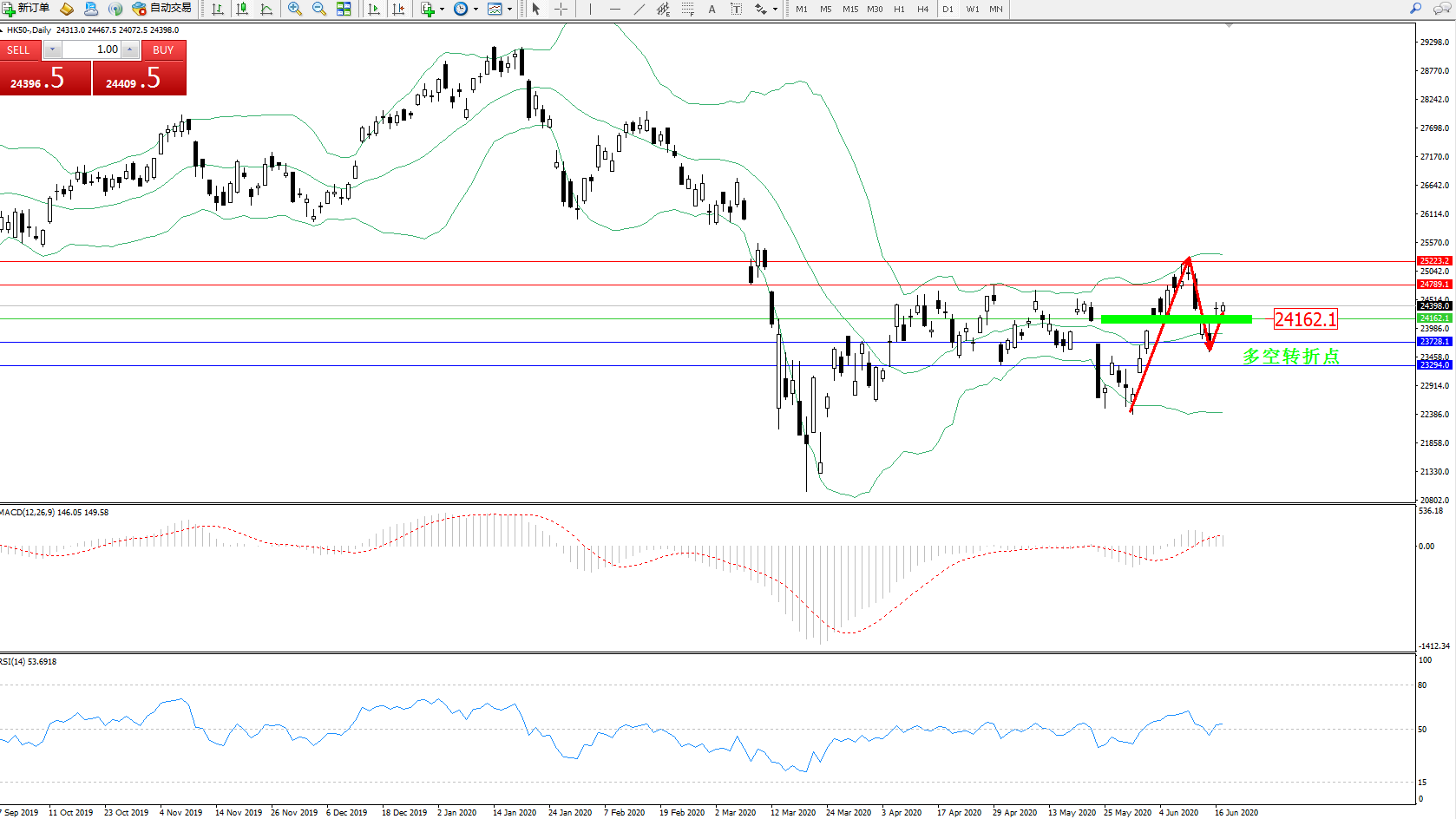 香港恒生指数617日(周三)收盘上涨137.32点,涨幅0.56%,报24481.41点;亚太股市涨跌互现,香港股市整理,市场炒股不炒市,聚焦科技股。美团今日再创上市新高,医药股、抗疫概念股大涨,百信国际涨超17%,康哲药业涨超10%。港股市场回暖的主要原因在于先前机构投资者所担忧的海外不确定性在短期内出现缓和,包括美欧复工后尚未见到大规模二次爆发;欧美失业改善情况好于预期;地缘政治风险的实际暴露低于之前机构投资者的预期;这些因素使得部分投资者回补仓位,亦加大了港股市场反弹力度。港股延续强势,并沿上升通道挺进,但上方压力开始浮现,由于累积较大获利需求,短线大盘或需进行休整,但预计行情整固过后,港股仍将延续上行趋势,投资者可根据自身仓位适度调整持仓水平。