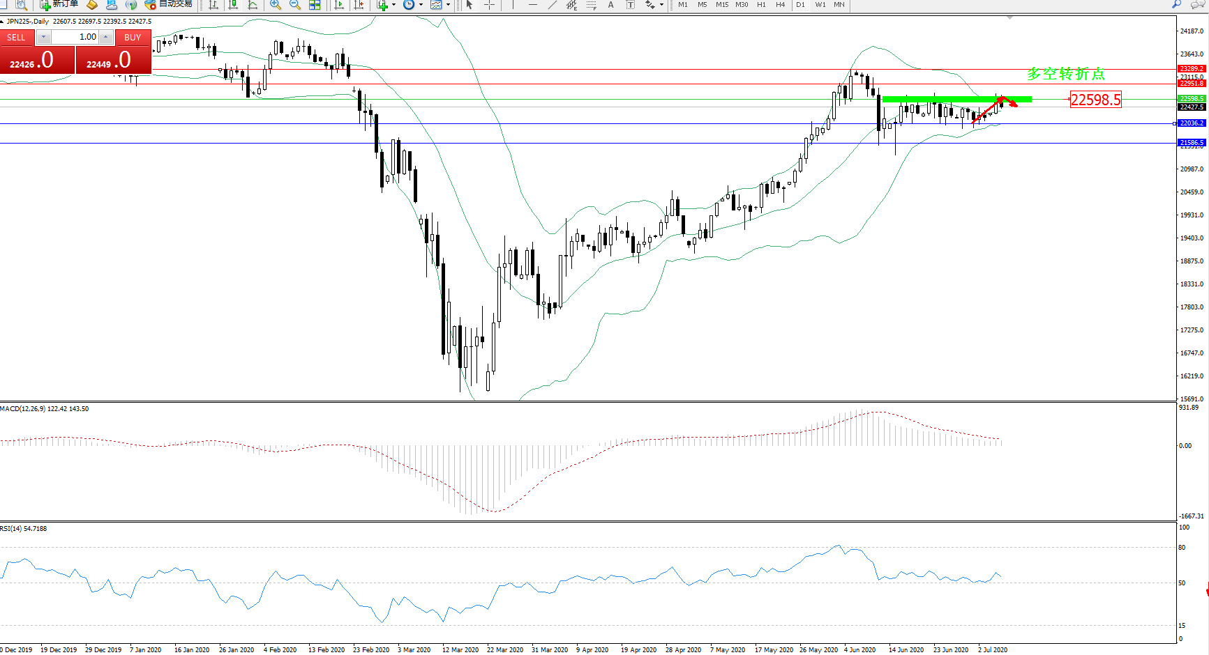 日经225指数77日(周二)收盘下跌140.94点,跌幅0.62%,报22573.50点。亚洲股市继续走高,尤其是中国股市继续大涨,美元指数也探底回升,而投资者似乎对愈加严峻的疫情产生了免疫,市场目前仍处于高涨的情绪中。新冠疫情席卷全球以来,日本经济在今年上半年遭受重创,各项指标全面下滑。专家认为,在日本政府出台的大规模经济刺激计划作用下,日本经济会有一定起色,但长期来看,由于多种因素影响,复苏进程可能十分缓慢。日本央行71日发布的今年第二季度企业短期经济观测调查结果显示,继上季度之后企业信心继续大幅恶化。其中,大型制造业企业信心指数从上季度的负8点降至负34点,为2009年二季度以来最低水平。