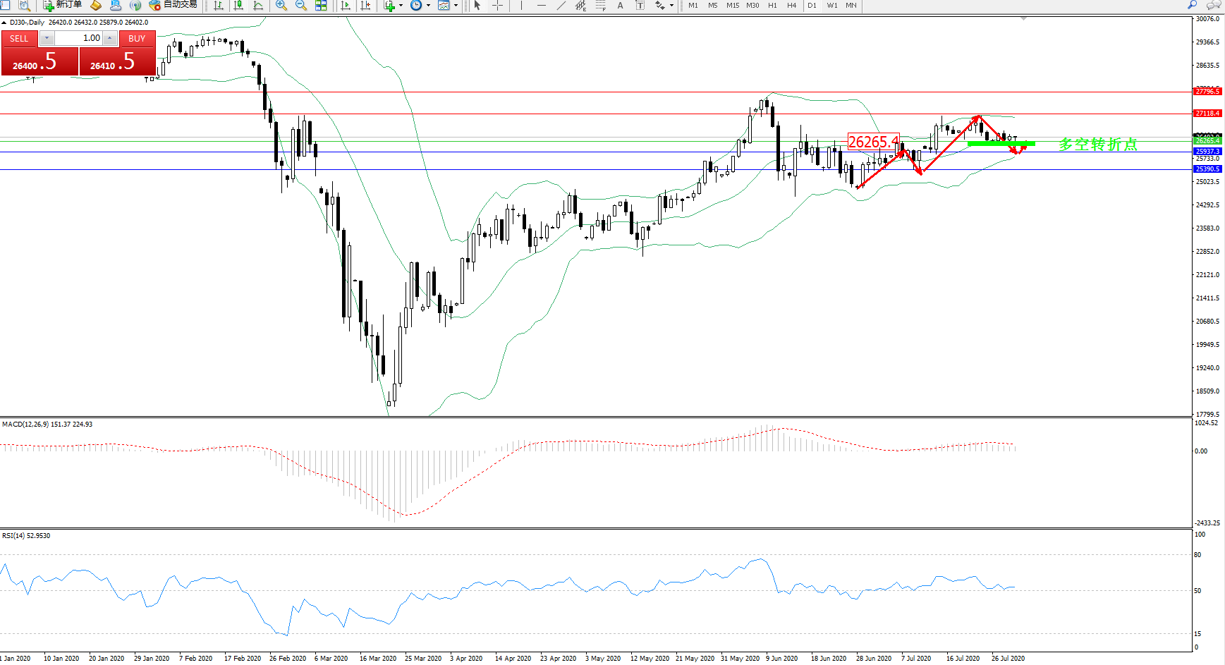 道琼斯指数7月30日(周四)收盘下跌225.90点,跌幅0.85%,报26313.65点。美国股市周四尾盘缩小跌幅,业绩利好推动大型科技股上涨,盖过了对经济复苏缓慢的担忧。美债收益率连续第三天下跌,拖累金融股走低。由于业绩稳健并且一系列产品受益于社交隔离措施,大型科技公司在新冠疫情引发的经济衰退中表现更好,此前消息称一种实验性冠状病毒疫苗在早期试验中对猕猴有效。股市收窄跌幅,美元周四跌至2018年5月以来的最低水平,此前美国总统特朗普提出推迟11月大选的想法,并且数据显示美国经济在第二季度经历了至少是1940年代以来最严重的萎缩,第二季度国内生产总值(GDP)环比萎缩9.5%,折合年率萎缩32.9%。此外,美国首次申领失业救济金的人数连续第二周增加,表明美国经济反弹正面临越来越大的风险。