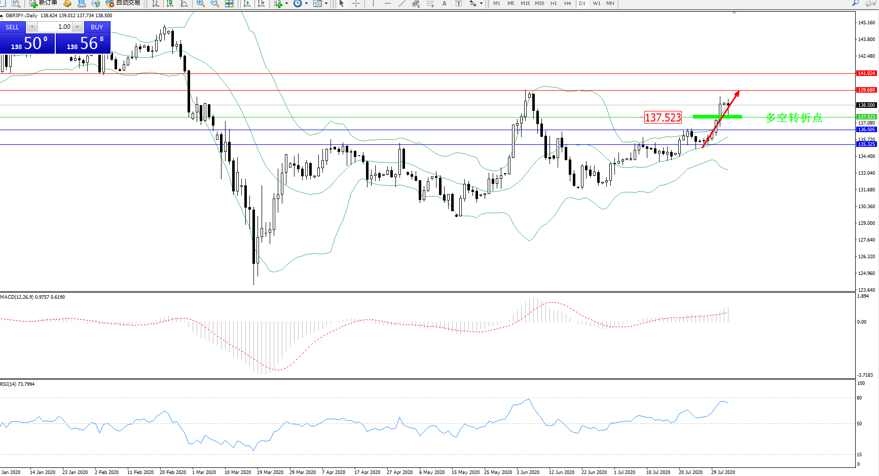 英镑兑日圆持续震荡于138.500附近徘徊,在复苏轮廓变得更加清晰或出现新的冲击之前,英国央行料不会进一步放宽政策。目前尚不清楚英国央行会否在本次利率决议上给出完整的经济预期,还是像5月份那样给出更简单的“情景”分析。无论哪种情况,我们都预计英国央行将表示经济增速前景发生变化。失业率很可能会在今年晚些时候达到峰值,这将使通胀低于2021年的目标。此外英国脱欧协商进展也需留意,英国脱欧谈判首席代表弗罗斯特称,英国和欧盟第9轮谈判将于9月28日至10月2日当周举行。