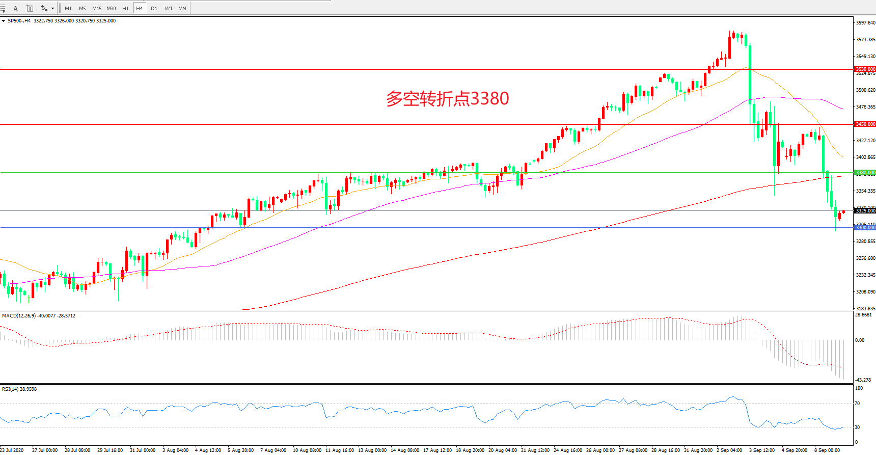 4小时图看,标普500长阴下破,整体表现相对低迷,3300成为短期支撑,短期均线拐头向下, MACD绿柱增加,RSI指标走平,日内延续下行概率较大。