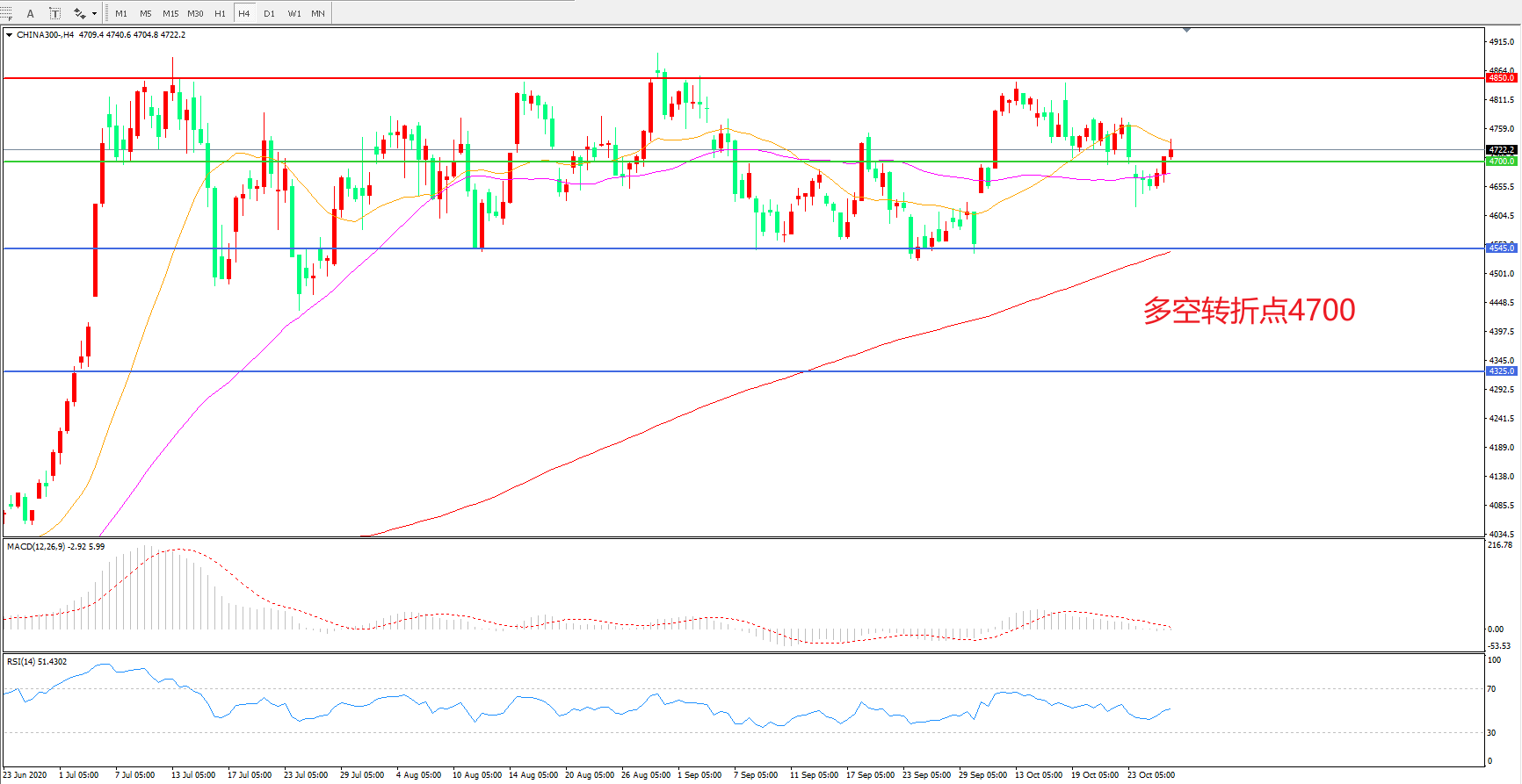 4小时图看,沪深300小幅反弹,整体表现有所回暖,4700成为短期多空分水岭,55周期均线成为短期支撑, MACD红柱缩短,RSI指标向上,日内延续震荡概率较大。