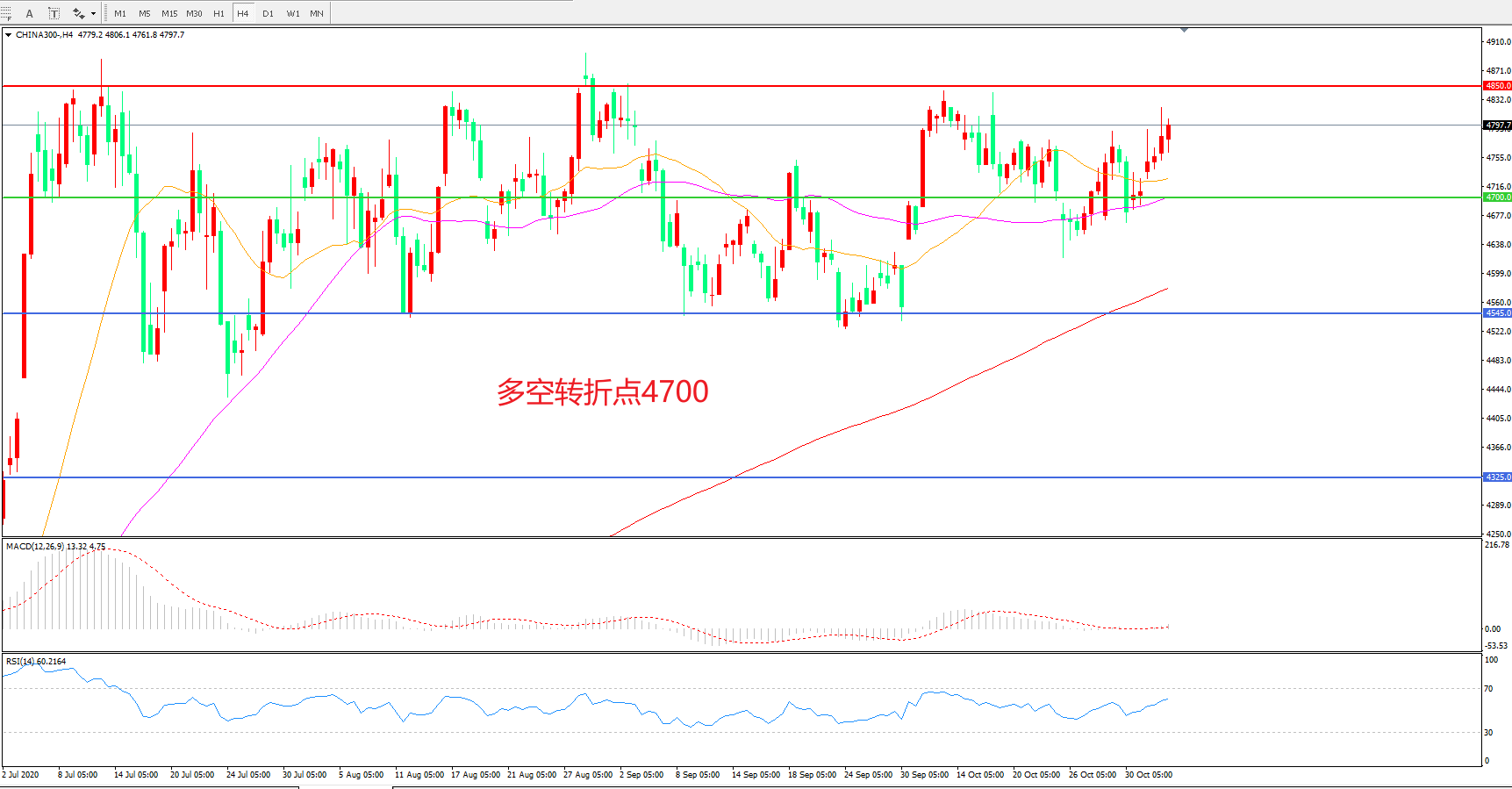 4小时图看,沪深300震荡上行,短期走势有所回暖,21周期均线成为短期支撑,MACD红柱增加,RSI指标向上,日内延续上行概率较大。