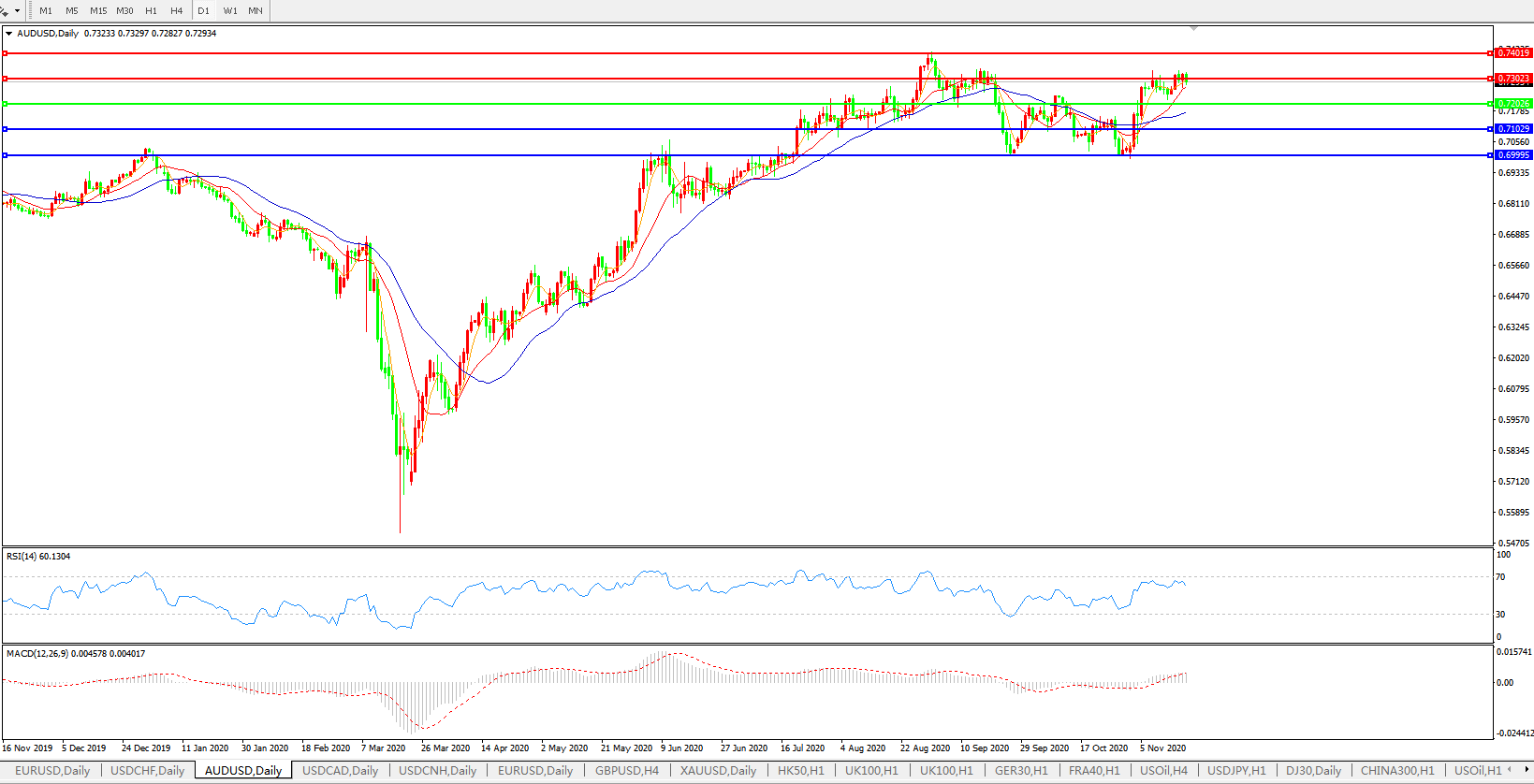 澳元兑美元在周三亚市早盘一度因全球避险情绪升温而跳跌,但此后汇价收复了日内跌幅,并在欧洲时段盘初收复0.73关口转为上涨,因美元指数日内的下行压力更为显著,美元挫跌后美元计价大宗商品价格随之回升,抵消了商品系货币此前面临的全球经济风险冲击;投资者当前面对美国持续不断的政治危机,以及同时在多州涌现出的新一轮疫情风波,不得不对美国经济在年底之际的处境进一步看空,而隔夜的美国零售销售数据也佐证了这一点。这令美元的漫漫熊途仍在延续,在此背景下,非美货币也因而出现了“鸡犬升天”式的涨势; 分析师指出,虽然澳元汇价仍不可避免会受到贸易风险和全球经济困境溢出冲击,但是澳洲远离欧美疫情震中的状况仍意味着其可能在一定程度上成为资金的新避风港。在此背景下,德国商业银行的分析师继续看高澳元兑美元,认为其在短期内将冲击9月的高点0.7413,并可能在之后进一步寻求突破至0.75上方。