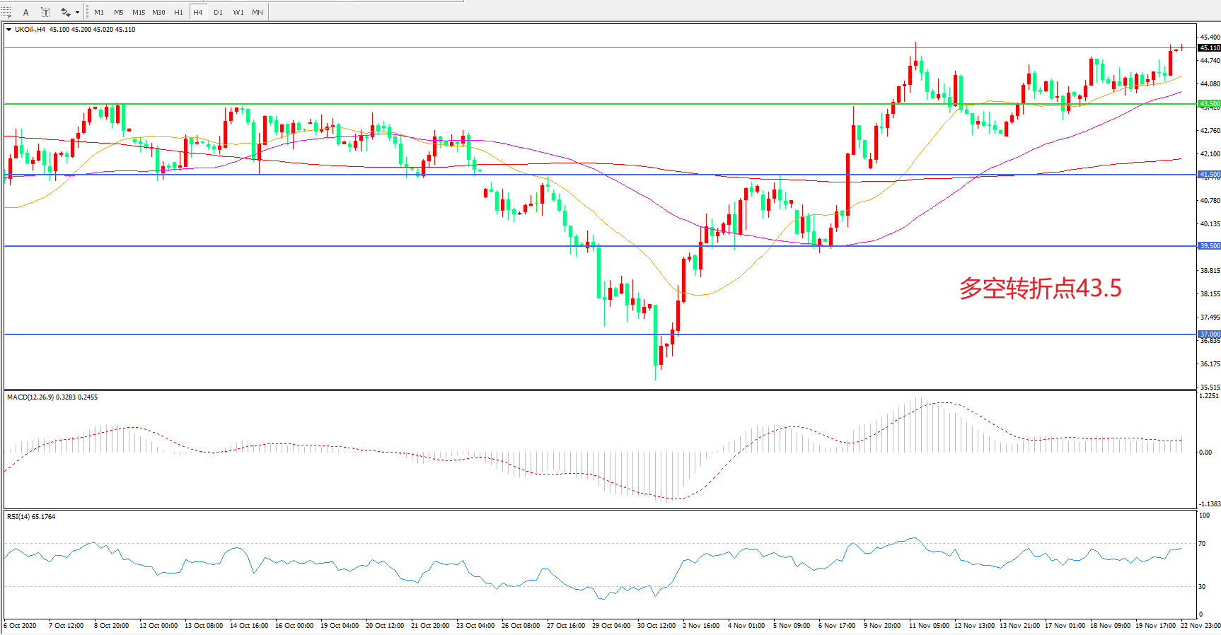 4小时图看,油价站稳21周期均线后震荡上行,短期表现有所回暖,43.5成为下方支撑MACD红柱增加,RSI指标走平,日内震荡上行概率较大。
