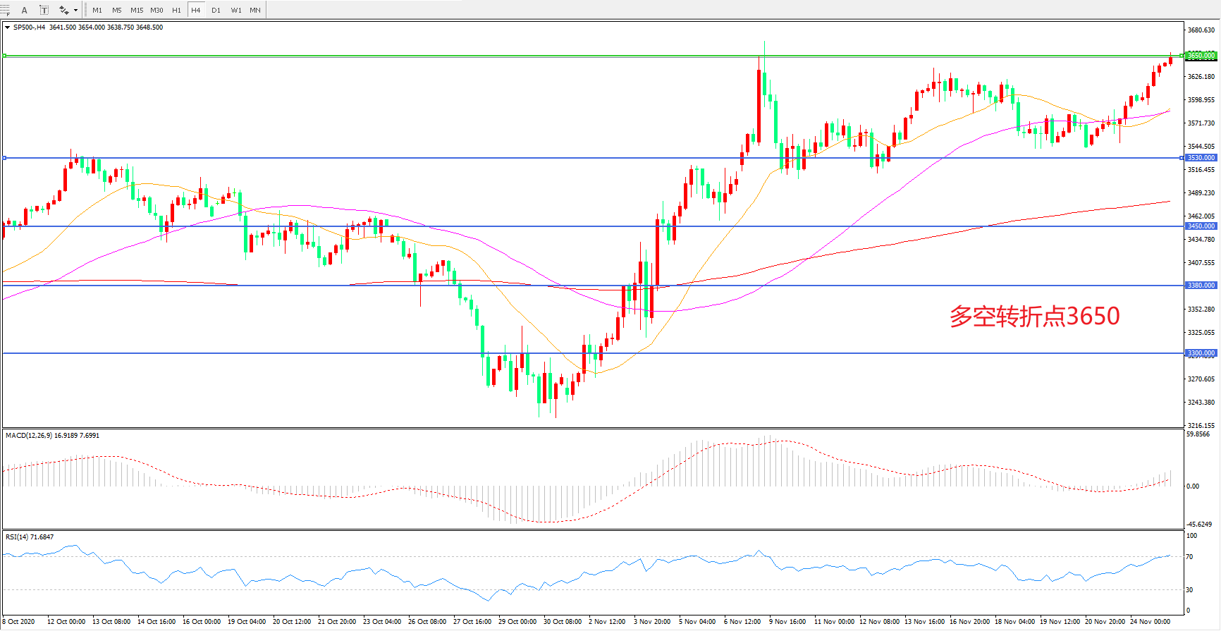 4小时图看,标普500震荡反弹,整体走势偏强,3650成为短期多空分水岭,3530成为短期支撑,短期均线拐头向上,MACD红柱增加,RSI指标向上,日内延续上行概率较大。