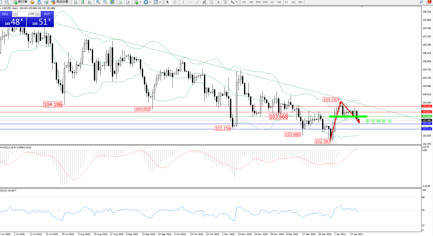 美元兑日圆震荡回撤至103.486附近节点,日本央行周四维持货币政策不变,并上调了对于下个财政年度的经济增长预估,暗示央行目前已采取了足够的刺激措施来帮助经济抵御新冠疫情的打击。经济前景面临的风险加大,因为本月新推出的紧急状态措施打击消费,而且威胁到脆弱的经济复苏。日本央行在季度展望报告中称,“我们的预期可能会根据疫情发展及其对国内外经济的影响而调整,因此不确定性极高”。日本央行副行长雨宫正佳未参加会议,因为在一名亲属进行核酸检测后,他正居家预防。基于对政府大规模支出方案将缓解疫情冲击的希望,日本央行在最新的季度预估中小幅上调下一财年的增长预期至3.9%,三个月前预估为增长3.6%。但是央行对消费的看法较为黯淡,警告说服务支出将继续处于“强劲的下行压力”之下,并可能给经济增加通缩动力。