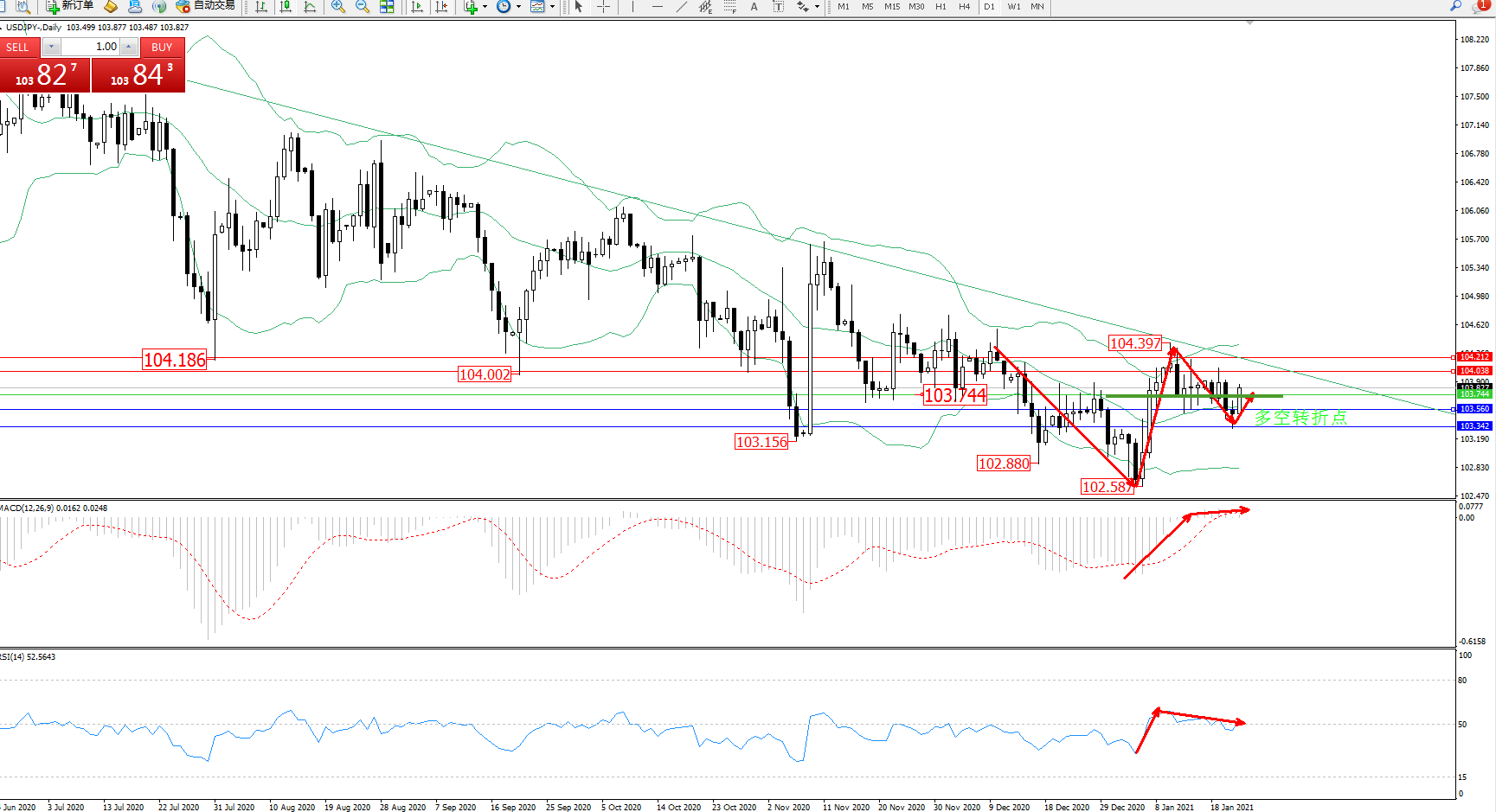 技术点评:空头动力延续布林带指标通道中下区间持续震荡下行至102.587附近节点后强势反转上扬,短暂突破上轨附近至104.397节点后维持整理平移中,纠结于中轨附近徘徊后再度回升,布林带指标呈张口走势后开始收口平移,MACD指标处于0轴线上方弱势徘徊中,RSI指标处于50均衡线附近弱势整理中;
