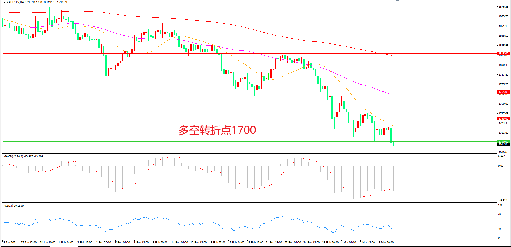 周四(3月5日),美联储主席鲍威尔在讲话并未透露任何要为今年通胀回升而行动的信号,美债收益率盘中飙升,美元指数大幅上涨,创去年12月1日以来新高。现货黄金延续低迷表现,长阴下破后收报1697.17美元/盎司。尽管从技术上讲,黄金已经超卖,但美债收益率上升体现出市场对美国经济复苏的信心,近期操作依然以逢高做空为主,切勿盲目抄底。