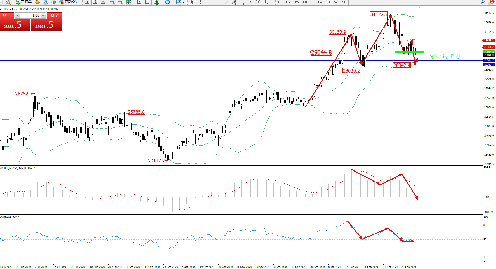技术点评:多头动力延续布林带指标通道中上轨区间持续震荡上移至31122位置附近遇阻回撤,持续震荡下移至布林带指标下轨附近节点附近后得到短暂支撑,低位抵达28342附近节点后快速反转上移,纠结于中下轨区间持续震荡中,布林带指标呈收口走势后开始走平,MACD指标处于多头区域维持震荡后向下移动触及0轴线附近有继续向下移动态势,RSI指标处于多头区域维持震荡回撤至50均衡线附近弱势徘徊中;