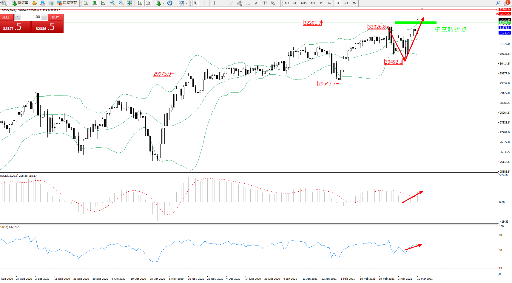 道琼斯指数3月10日(周三)收盘上涨464.35点,涨幅1.46%,报32297.09点;强劲的经济增长可能刺激2月份处于温和状态的通胀数据将来走高。美国经济活动升温将成为可能最终促使美联储调整其低利率政策的因素之一;CPI数据后发布报告称,正目睹很多地方通胀下降时期的结束,以及经济增长和物价被重新评估到令人印象深刻的更高水平。在不出现由新冠疫情引发的经济二次见底情况下,很难认为市场所消化的2023年前美联储将加息一次的约60%概率太高了;在联邦公开市场委员会3月16日至17日会议之前,人们正在揣测政策制定者将需要在未来的某个时候进行多次加息。这种观点与最近美联储一些官员旨在强化央行鸽派政策立场的评论产生冲突,从而使得下周的政策会议更有看点。