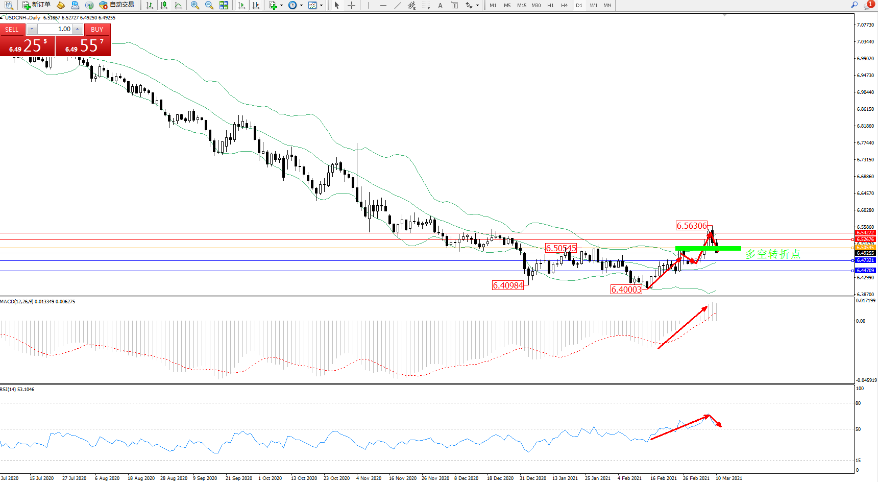 交易策略:6.50545下方看跌,目标6.47321、6.44709