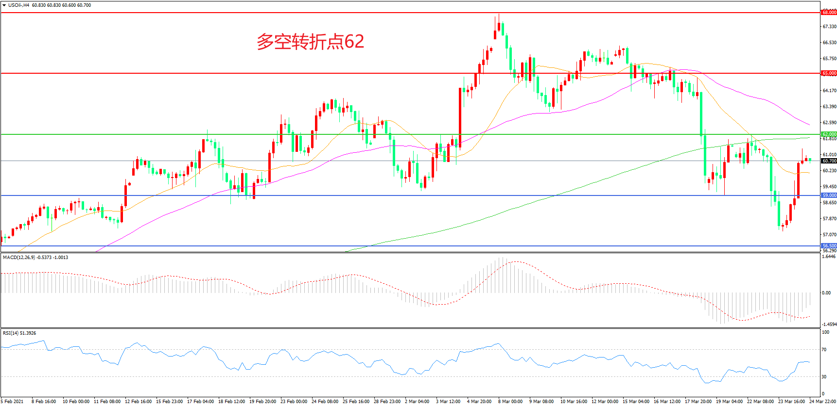 4小时图看,油价长阴下破后探底回升,短期行情有所企稳,62美元成为上行阻力,21周期均线形成短线支撑,MACD绿柱缩短,RSI指标走平,日内延续震荡概率较大。