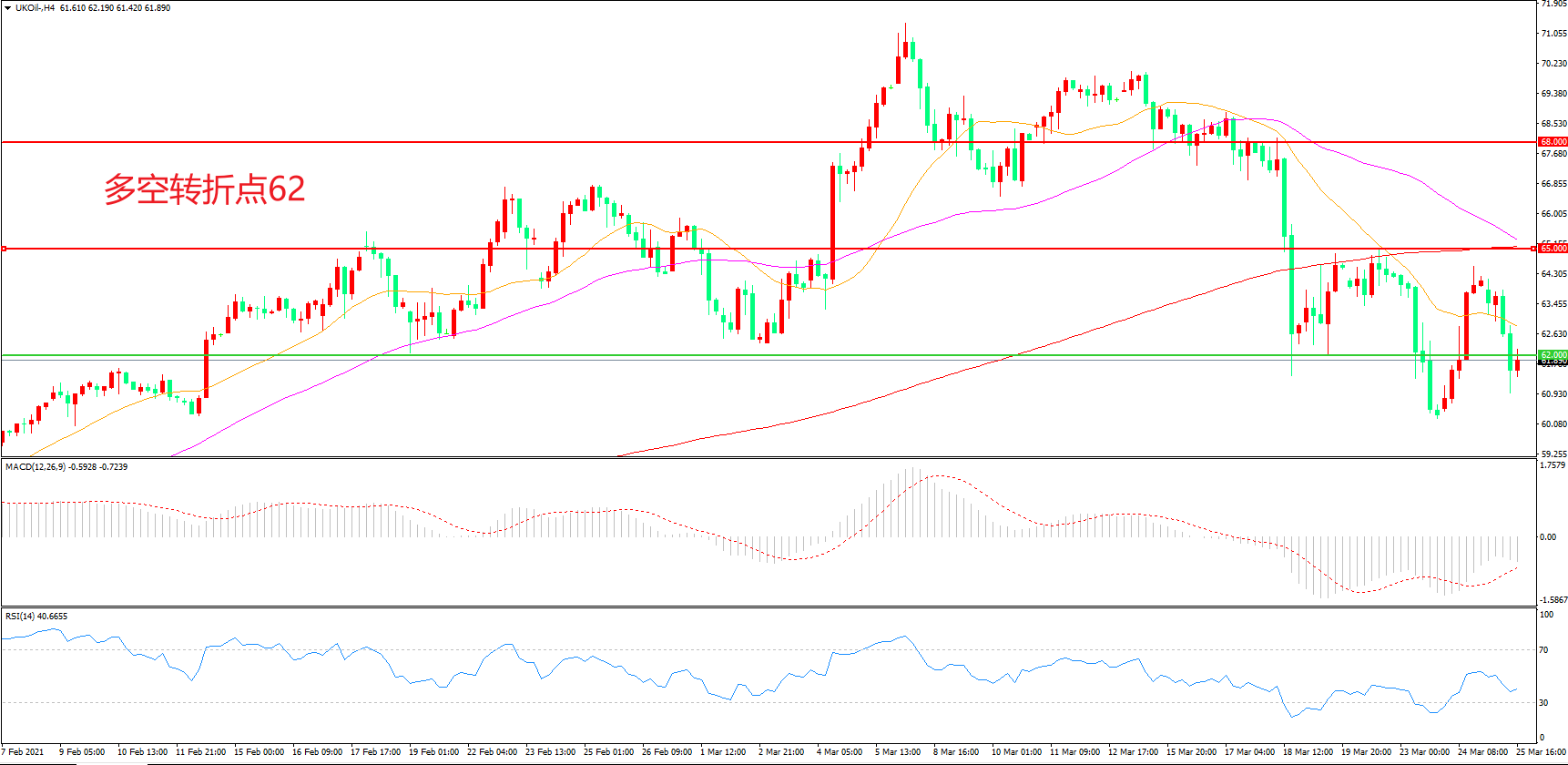 4小时图看,油价冲高反弹后再次下破,整体表现十分低迷,空头趋势明显,21周期均线形成上方阻力,62美元成为短线多空分水岭,MACD绿柱增加,RSI指标走平,日内延续震荡概率较大。