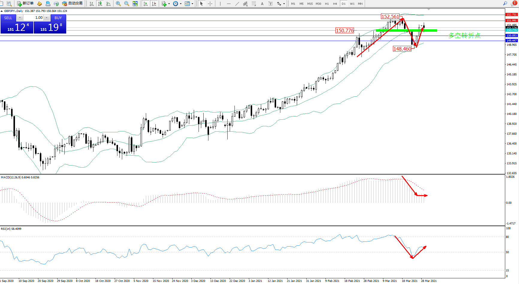 技术点评:多头动力延续布林带指标中上轨区间持续震荡上扬,高位抵达152.561位置节点附近遇阻回撤,触及下轨附近节点148.460附近后得到支撑开始反转上扬,多头动力强势反转突破中轨附近节点后有继续向上移动态势,布林带指标呈开始收口开始平移,关注中轨附近节点,MACD指标处于多头区域高位缓慢下移后开始平移,RSI指标空头动力持续震荡回撤至50均衡线下方震荡后急速反转上移;
