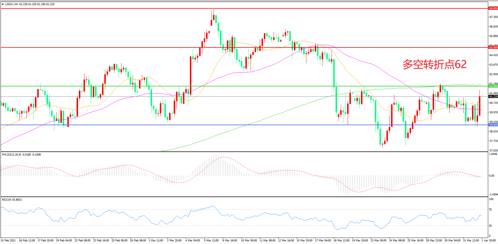 4小时图看,油价延续宽幅震荡走势,59美元成为下方支撑,62美元成为上方阻力,均线系统逐渐走平,MACD红柱缩短,RSI指标走平,节后延续震荡概率较大。