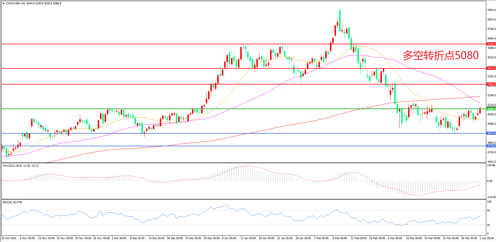 4小时图看,沪深300高开高走,短期走势有所企稳,5080成为多空分水岭,21周期均线形成下方支撑,MACD绿柱缩短,RSI指标向上,日内震荡上行概率较大。