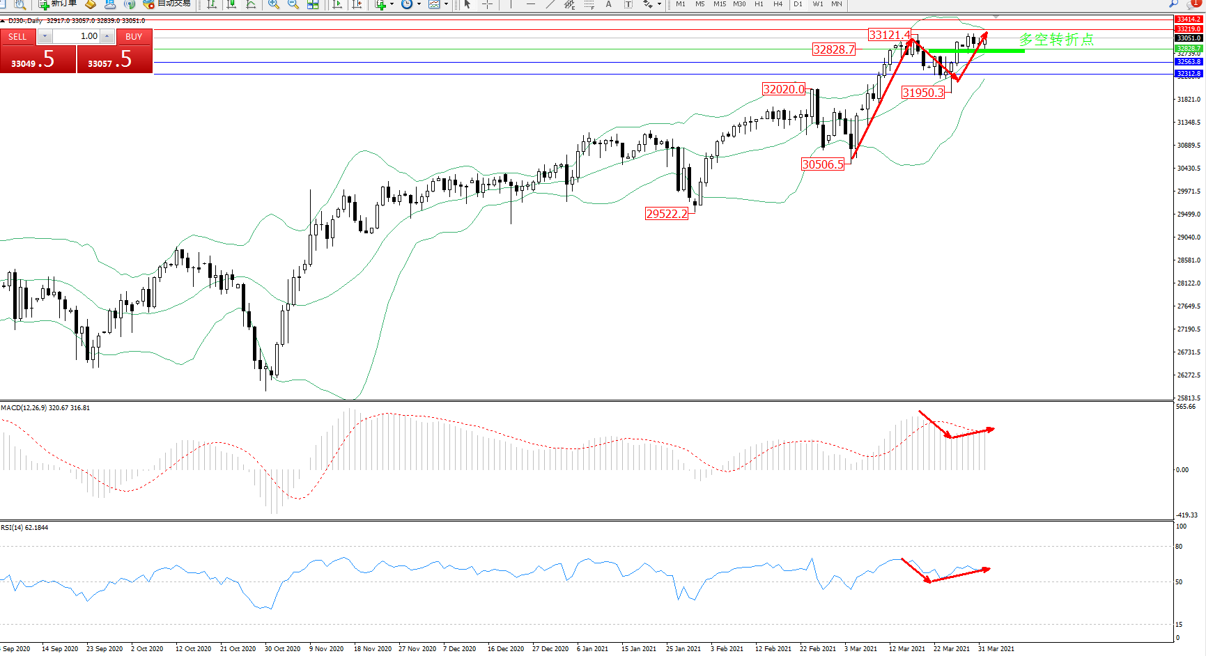 技术点评:多头动力延续布林带指标通道内持续震荡上扬,高位抵达33121位置后遇阻回撤,抵达31950位置得到支撑多头动力伺机入场反转上扬,多头不断向上拉升,处于中上轨区间持续震荡平移,布林带指标呈收口走势后不断向上移动,MACD指标处于多头区域高位持续徘徊,RSI指标处于多头区域高位弱势整理平移;