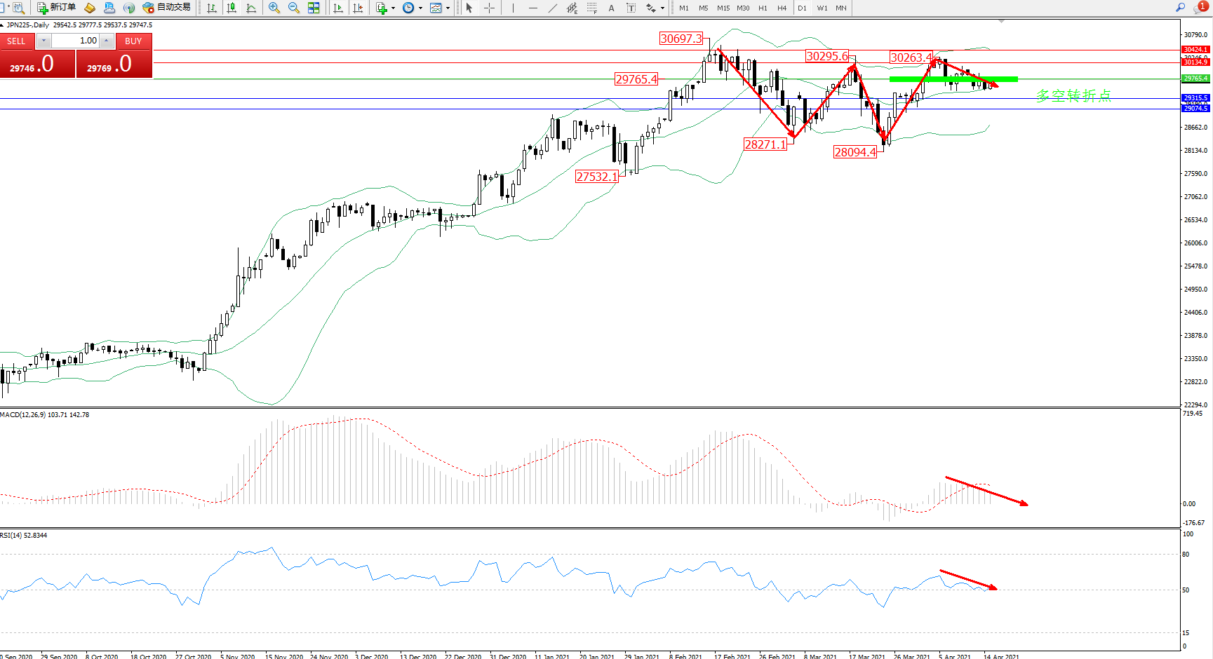 技术点评:长时间维持在布林带指标通道内宽幅震荡持续中,期间多次来回试探上下轨区间节点,多头动力上行至30263位置后遇阻回撤,触及布林带指标中轨附近节点后开始震荡,MACD指标处于0轴线上方多头区域维持震荡后有回撤迹象,RSI指标处于50均衡线上方多头区域维持震荡后反转下行持续徘徊中;