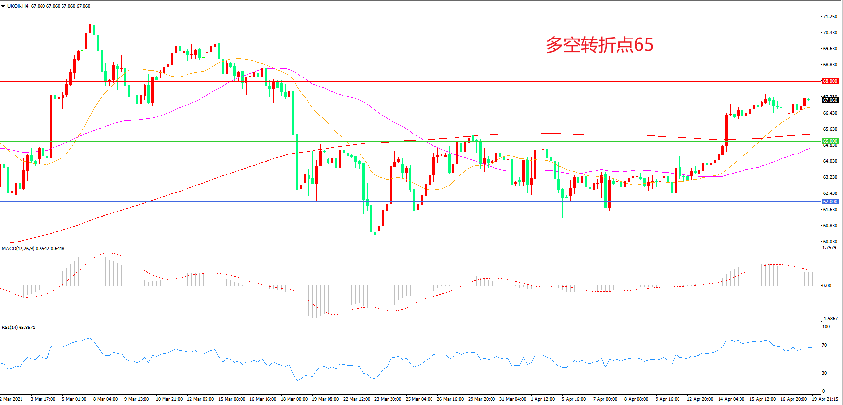 4小时图看,油价长阳拉升后延续高位震荡,整体表现偏强,21周期均线形成下方支撑,65美元成为多空分水岭,MACD红柱增加,RSI指标走平,日内延续上行概率较大。