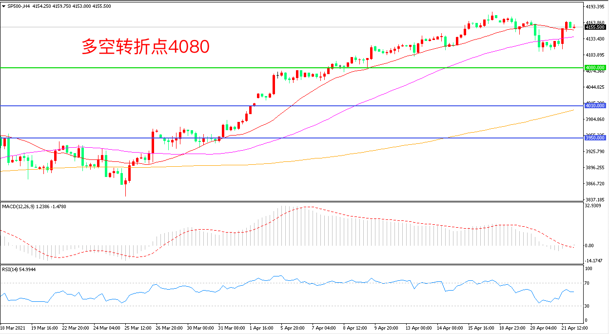 4小时图看,标普500回踩55周期均线后再度上行,短期表现依旧强势,多头趋势相对明显,MACD红柱增加,RSI指标走平,日内震荡上行概率较大。