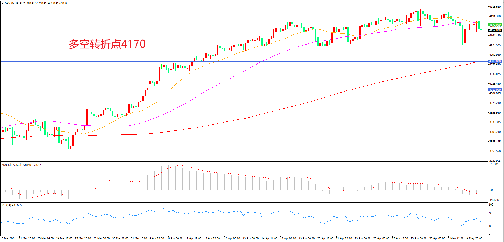 4小时图看,标普500高位震荡后长阴下破,短线走势陷入低迷,均线系统逐渐粘合,4170成为多空分水岭,MACD绿柱增加,RSI指标走平,日内延续震荡概率较大。