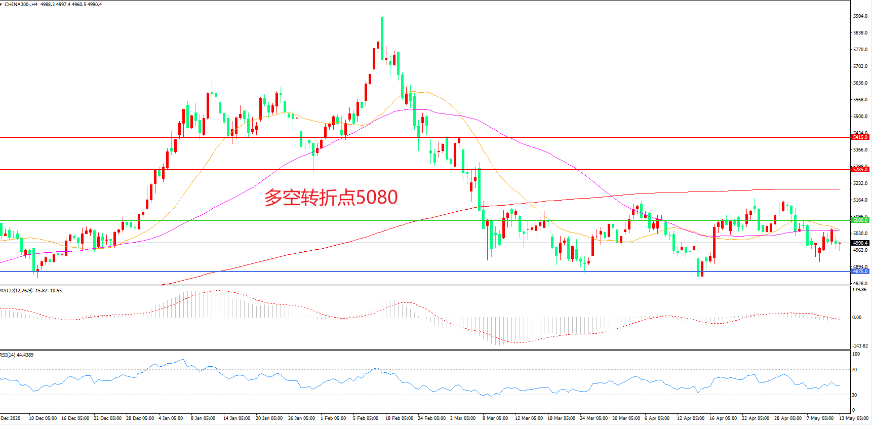 4小时图看,沪深300阳线连续拉升,短线走势有所回暖,均线系统形成的阻力的被突破,5080成为多空分水岭,200均线成为上方阻力,MACD红柱缩短,RSI指标向上,日内震荡向上概率较大。
